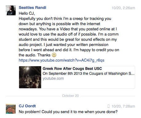 All of the footage that I recorded at the game and put on snapchat erased after 24 hours so I was left with no additional audio to play with. I searched the internet and found a video online of crazed fans screaming ” go cougs” after a WSU VS. USC game. So I tracked down the author to get their permission to use it in my video.